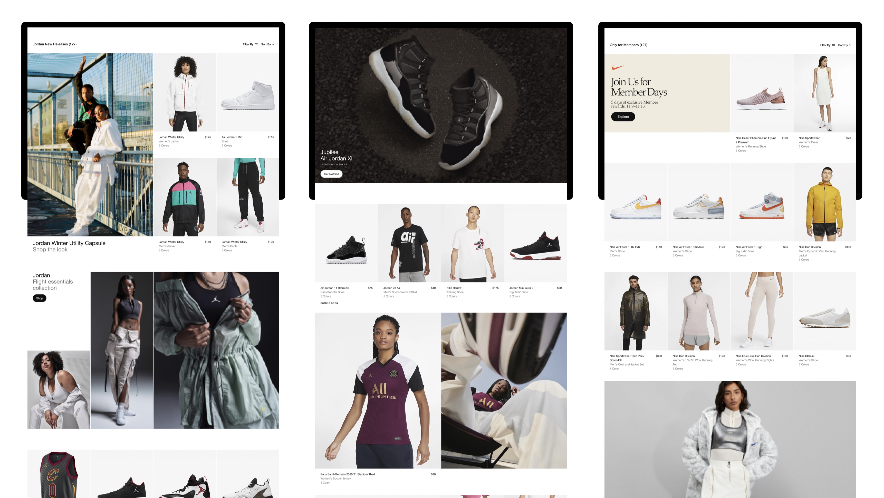 Our vision was to reimagine the Nike App and Nike.com product walls, moving from a flat, homogeneous grid to an experience that feels intuitive, dynamic, and tailored to each shopper’s interests. We wanted users to quickly find what resonates with them—performance needs, personal style, or new seasonal drops—while giving Nike a stronger and more flexible canvas to highlight its latest offerings.