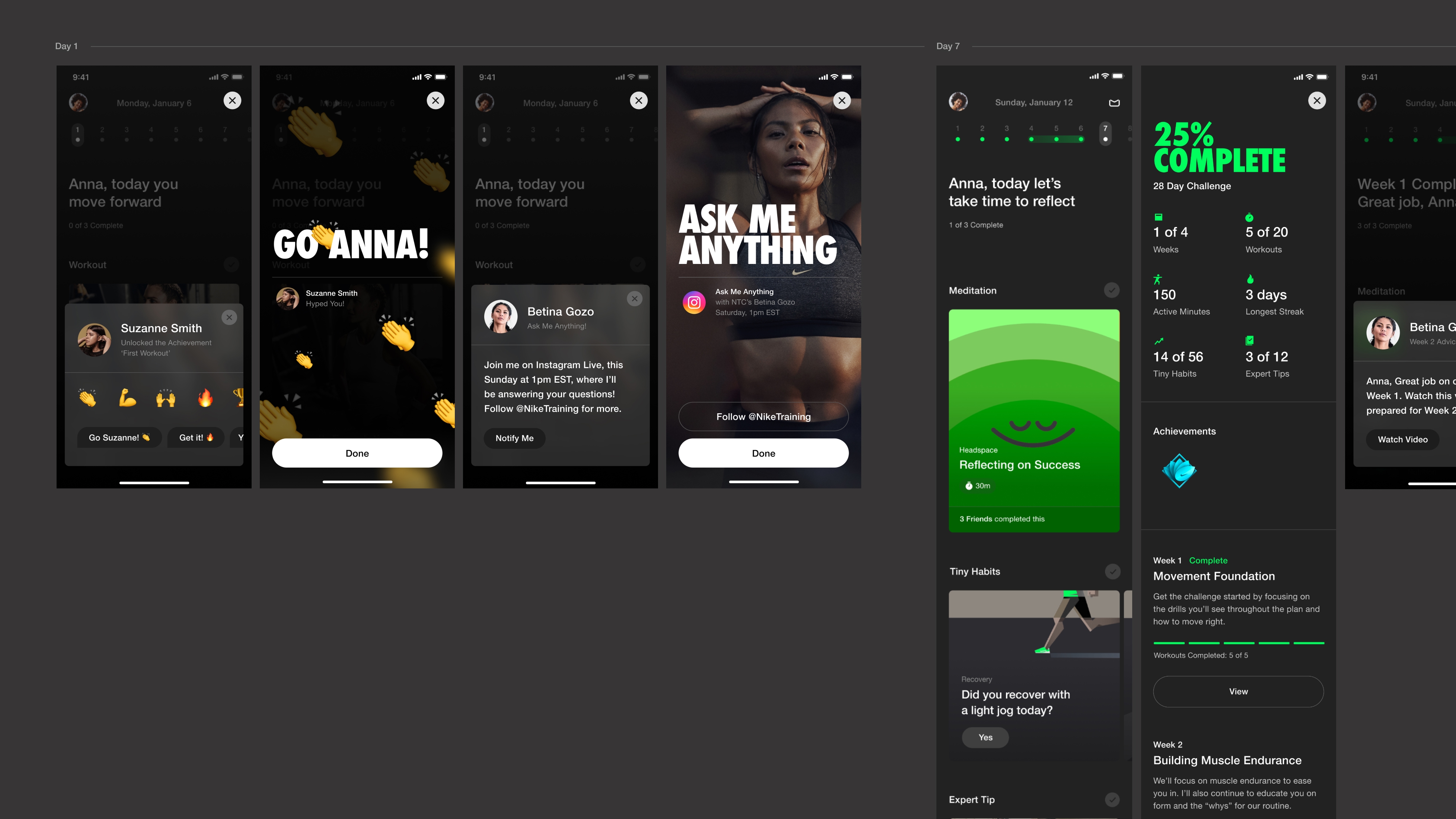 After the introduction of the Premium programs we developed an end-to-end concept of a 30-day challenge with fun workouts, daily guidance & motivation, support from your friends plus exclusive access to Nike’s best trainers, experts, athletes and wellness partners. This vision takes the NTC fitness programs to new horizons to be community driven for the first time, with live activations and next-level guidance.
